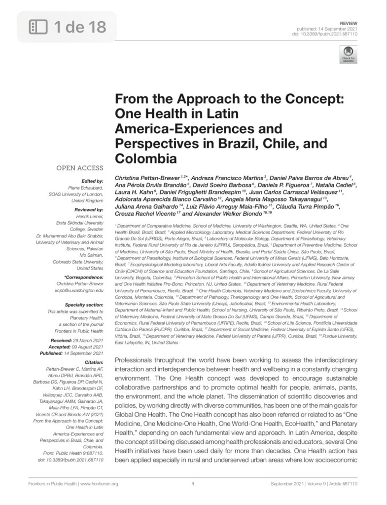 Autores: Christina Pettan-Brewer, Andreza Francisco Martins, Daniel Paiva Barros de Abreu, Ana Pérola Drulla Brandão, David Soeiro Barbosa, Daniela P. Figueroa, Natalia Cediel, Laura H. Kahn, Daniel Friguglietti Brandespim, Juan Carlos Carrascal Velásquez, Adolorata Aparecida Bianco Carvalho, Angela Maria Magosso Takayanagui,Juliana Arena Galhardo, Luiz Flávio Arreguy Maia-Filho, Cláudia Turra Pimpão, Creuza Rachel Vicente e Alexander Welker Biondo